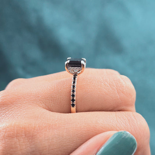 Emerald Cut Black Diamond Ring – 10K Rose Gold with Pave Band Accent