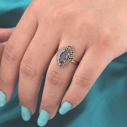 Glam Black Diamond Ring – Double Halo in Rose Gold