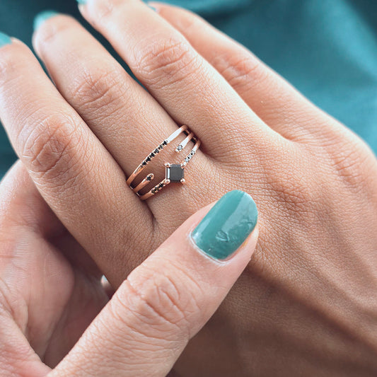 Princess Cut Black Diamond Ring – Bold Rose Gold Triple Band