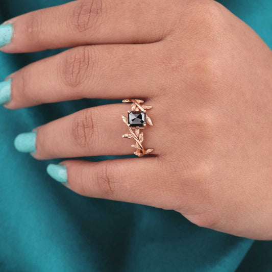 Emerald Cut Black Gem Ring – Rose Gold Leaf-Inspired Band
