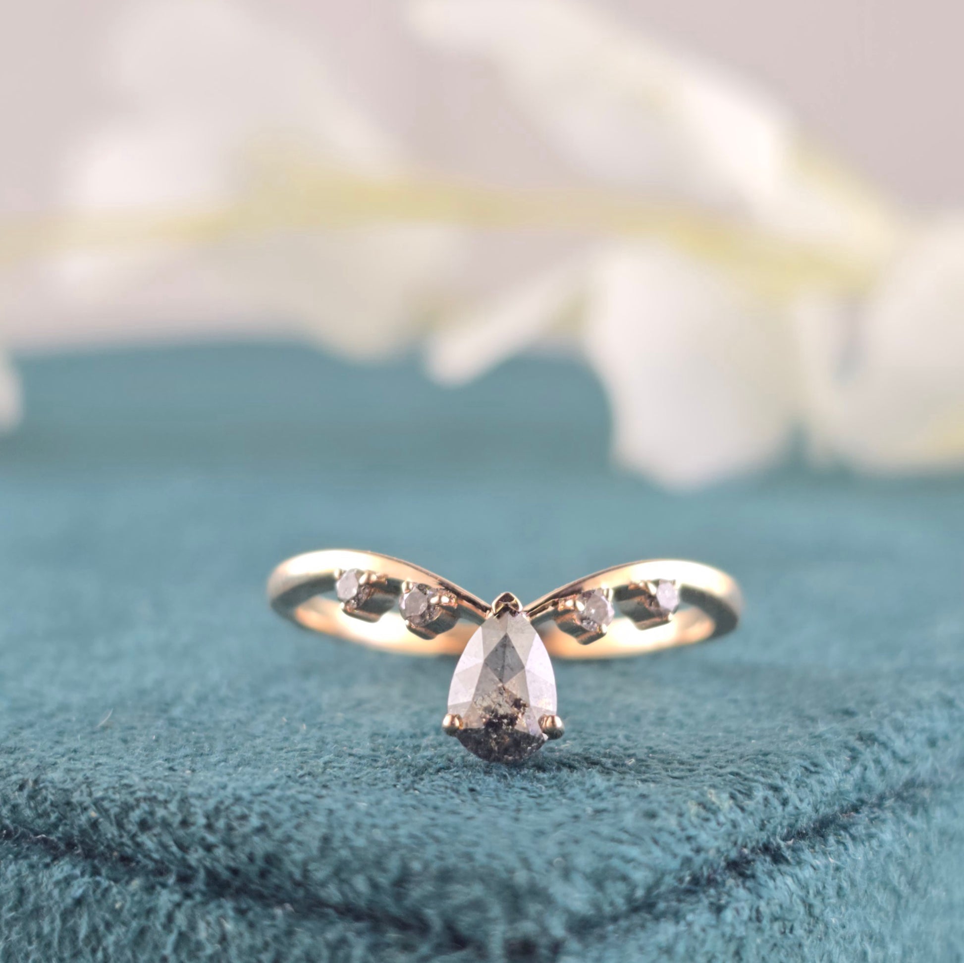 This Salt and Pepper Pear Diamond Engagement Ring in Gold is a delicate statement of modern romance. Featuring a pear-shaped salt and pepper diamond with natural white to grey shading, each inclusion tells its own story, making every ring truly one of a kind.