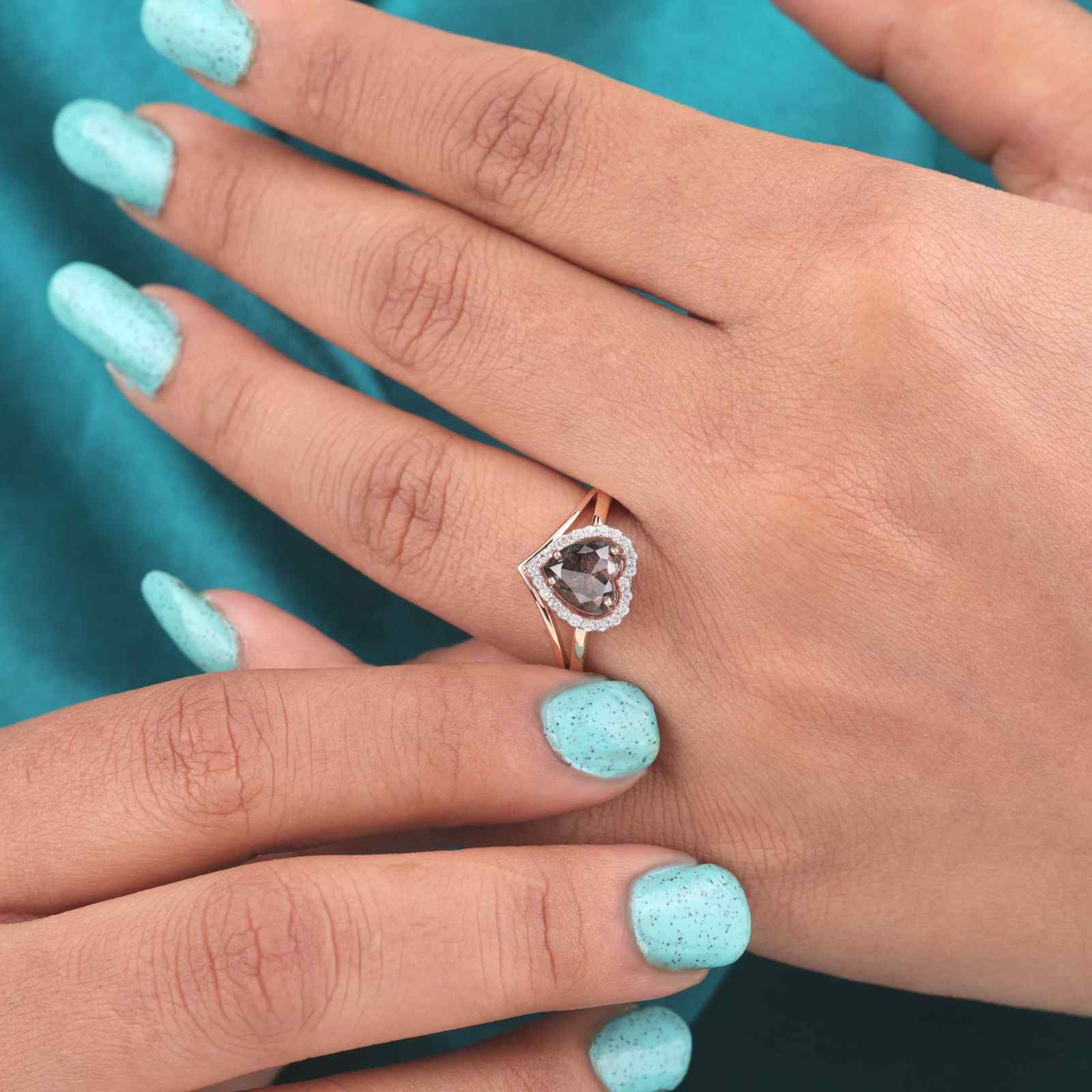 Celebrate love with a Heart-Shaped Salt and Pepper Diamond engagement ring in rose gold with halo setting. Raw, romantic, and refreshingly unique – this ring blends vintage charm with a modern twist.